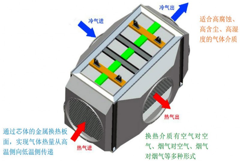 气气换热器又名双侧宽流道焊接式板式换热器或板式空气换热器,是我公司学习与吸收国内外先进技术与设计理念,近几年开发的一种新型板式热交换器,并且取得了相应的专利,它由一系列互相平行并压有定距柱的的薄金属平板相叠而成,主要由传热板片、外框密封板、压紧装置等组成。这种换热器特别适用于气气换热。